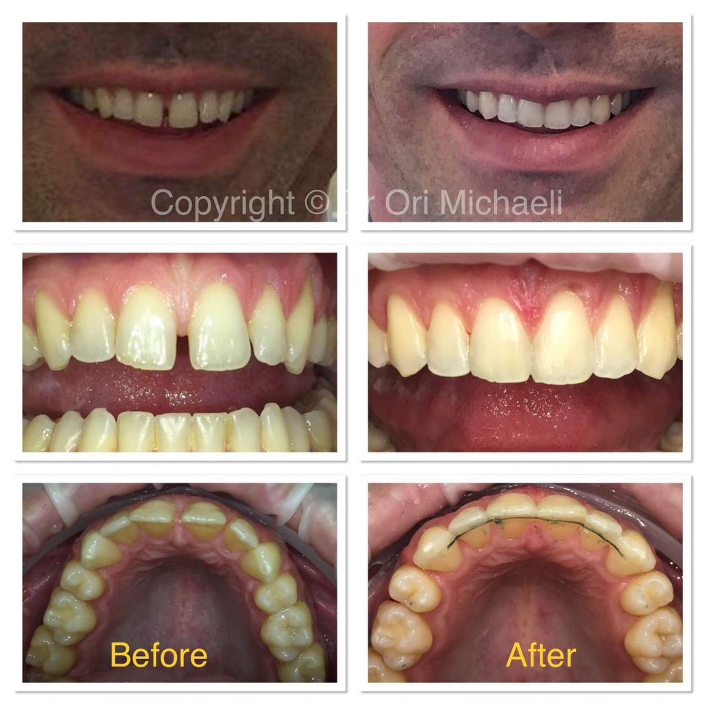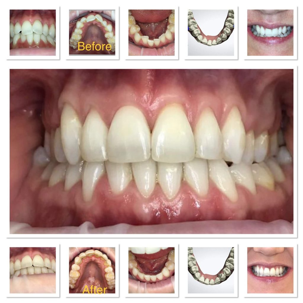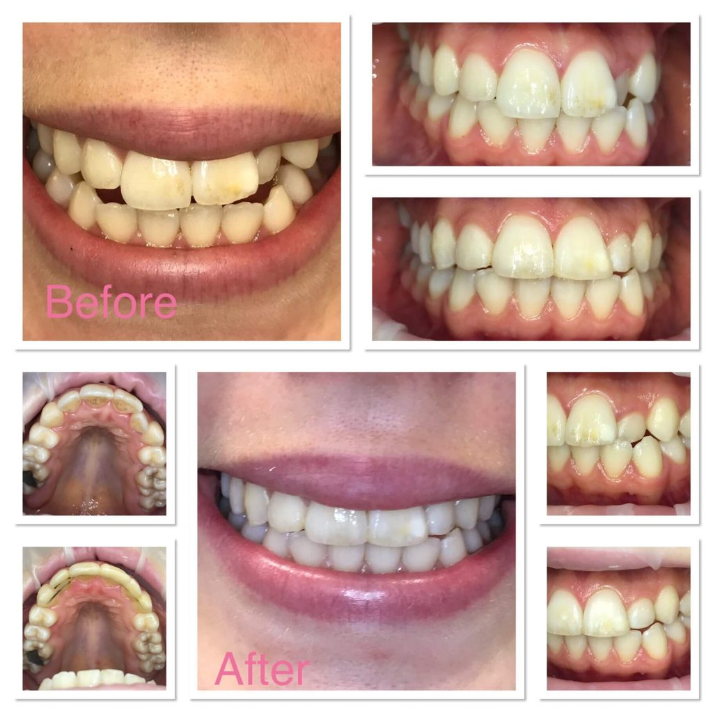Short term orthodontics using clear fixed braces on the upper teeth and composite build ups on the upper incisors.