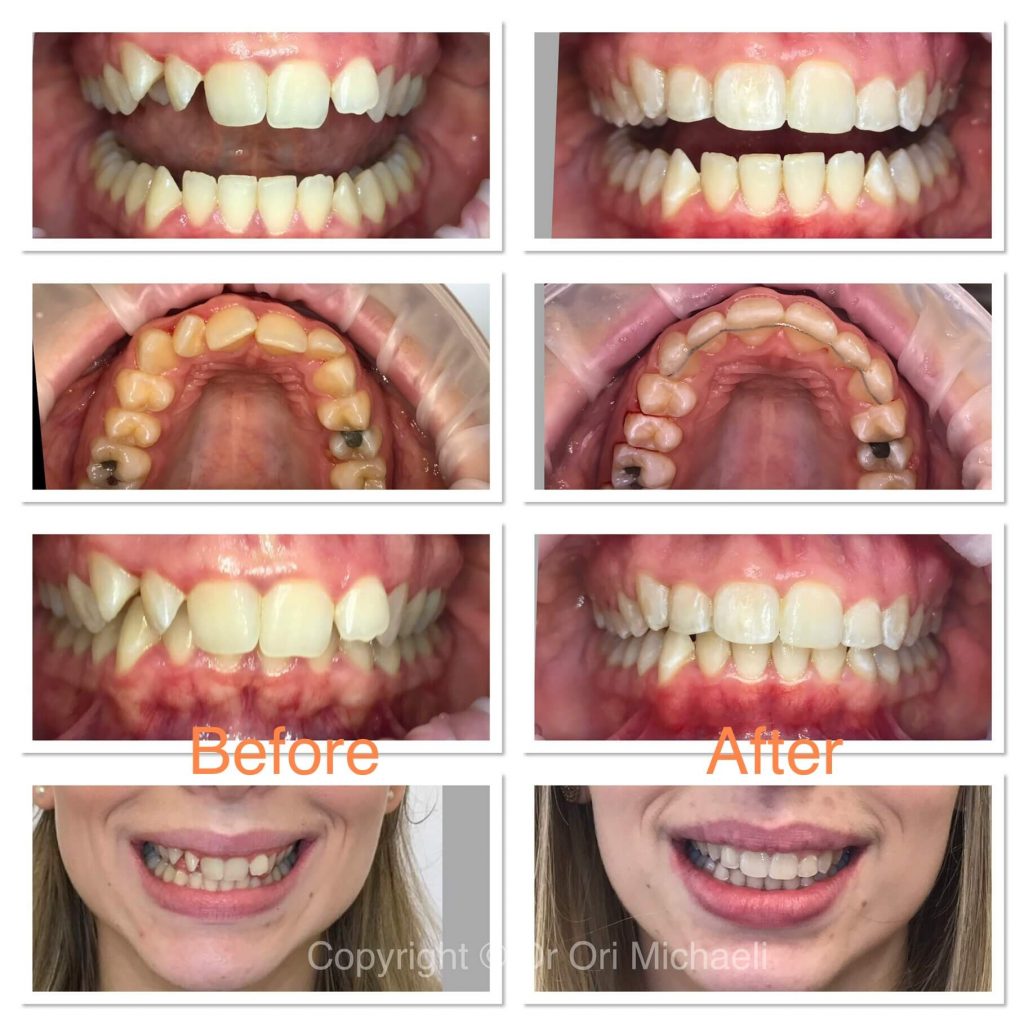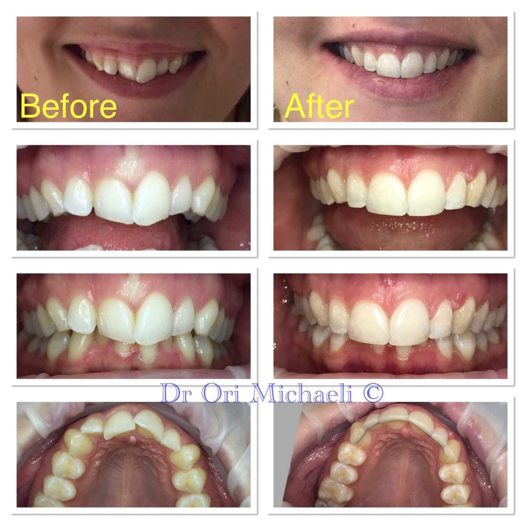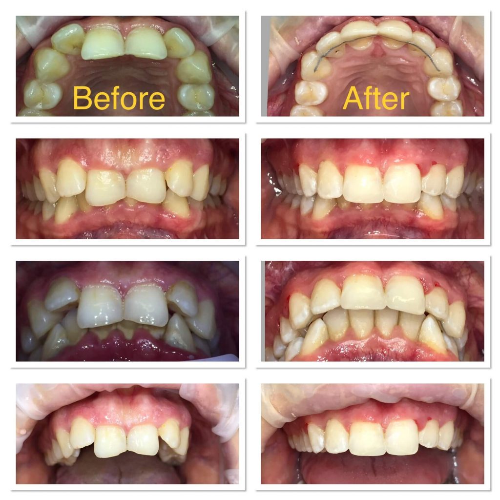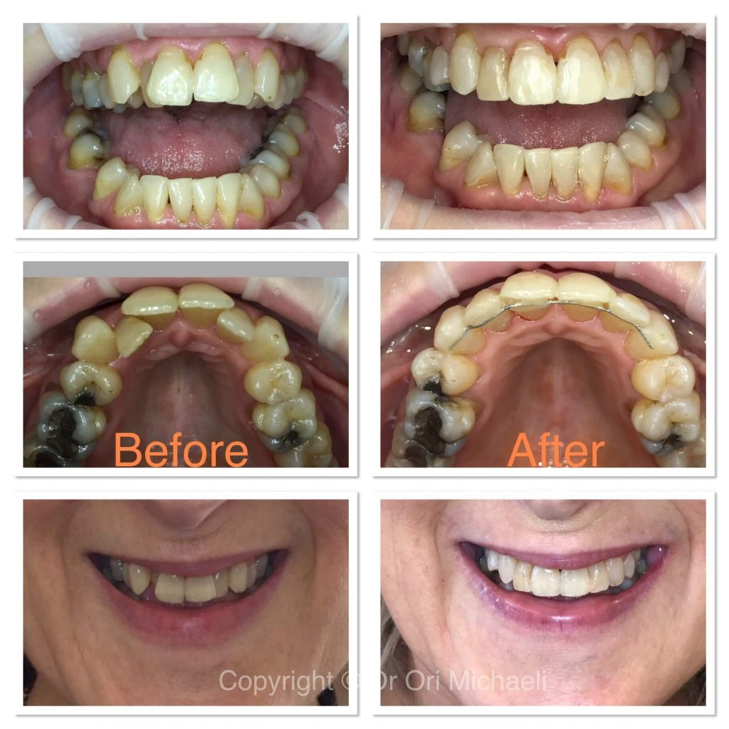 Short term orthodontics using clear fixed braces on the upper teeth and composite build ups on the upper incisors.