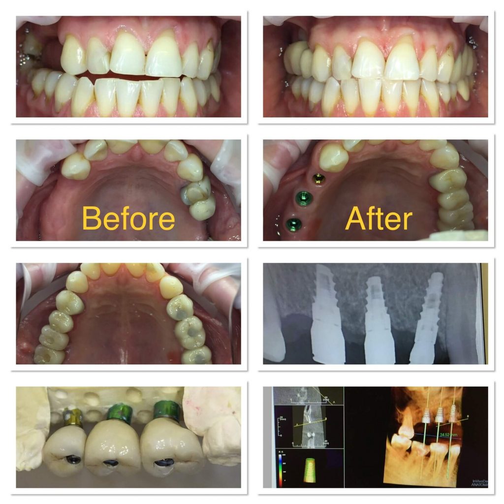 A full mouth rehabilitation including the replacement of failing teeth at the lower left side and lower front segment of the mouth using Biohorizons implants.