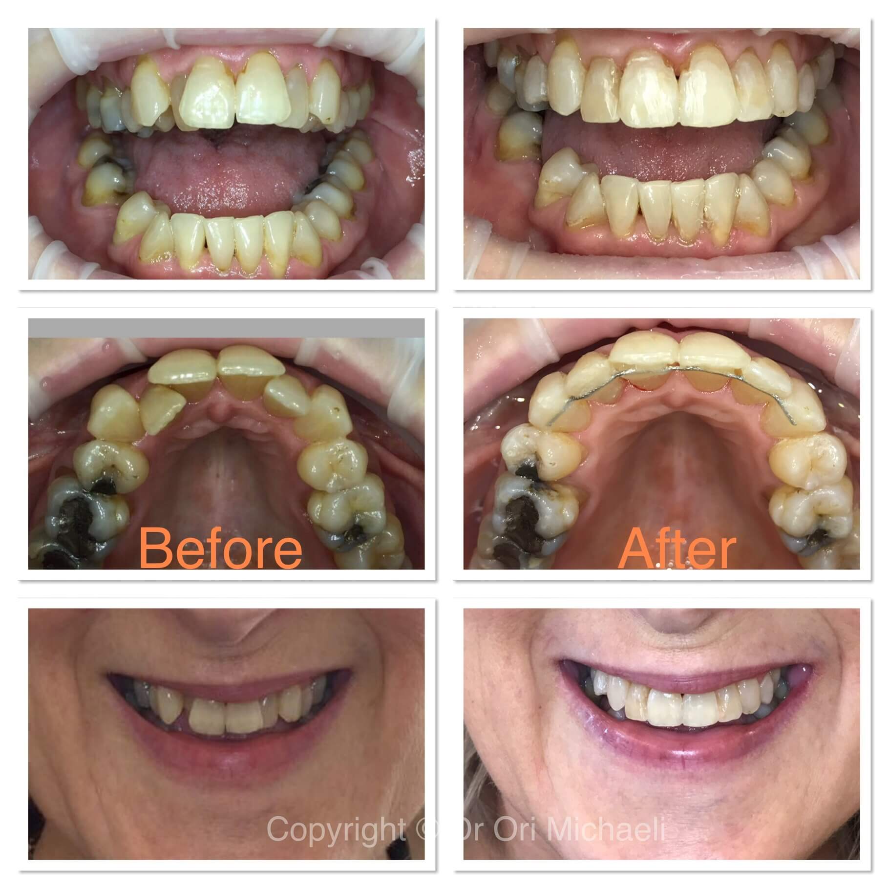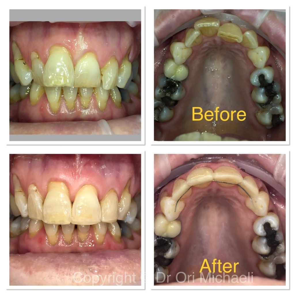 Short term orthodontics using clear fixed braces on the upper teeth.